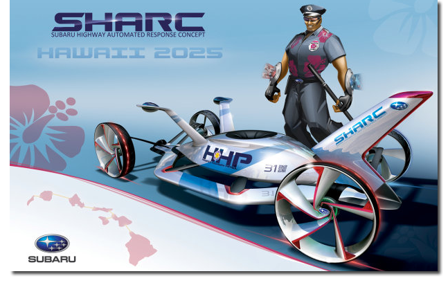 Subaru Global Design wins the 2012 Los Angeles Auto Show Design Challenge competition after the presentation of its SHARC (Subaru Highway Automated Response Concept) vehicle. As a futuristic model for 24-hour highway monitoring, the SHARC provides protection and rapid emergency response solutions for Hawaii's highway patrol.