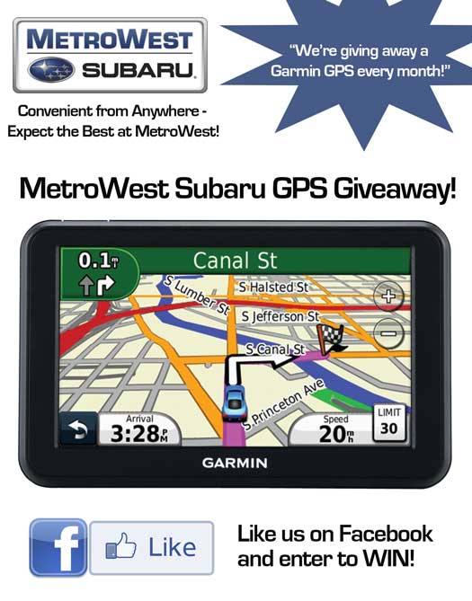 We're excited to announce our latest Facebook fan page giveaway - Starting today, we're giving away a Garmin GPS with Lifetime Traffic - EVERY month. All you need to do is like our page (or be a current fan) and post on note on our wall. That's it. You could tell us why you want the GPS, or just simply say hello! As a fan of the MetroWest Facebook page, you'll be the first to hear about maintenance specials, events and dealer news. It's our way of saying thanks for being a part of the MetroWest Subaru family!