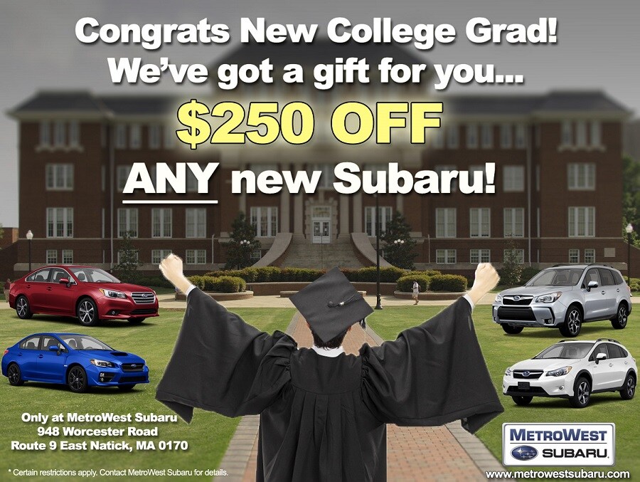 Note: All applications subject to credit approval by JPMorgan Chase Bank, N.A. through Subaru Motors Finance (SMF) and programs may chance at any time. Not all programs available in all states. College Grad Present program only available at MetroWest Subaru.