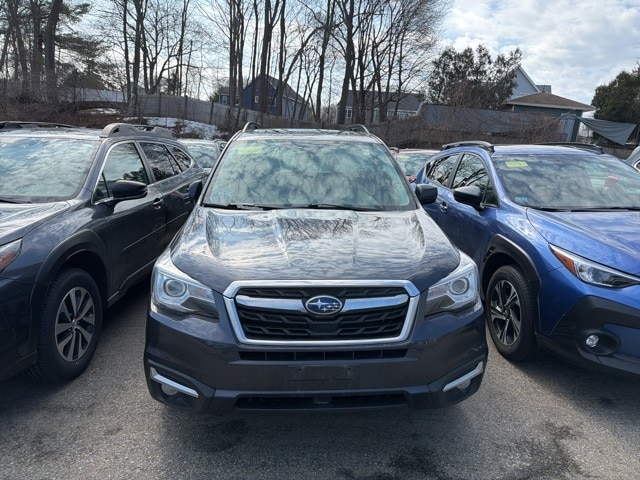 Dark Gray Metallic 2018 Subaru Forester 2.5i Limited AWD Lineartronic CVT 2.5L 4-Cylinder DOHC 16V VVT All Wheel Drive AWD, Bluetooth, Automatic temperature control, CD player, Dual front impact airbags, Dual front side impact airbags, Emergency communication system: STARLINK, EyeSight System, Front anti-roll bar, Front fog lights, Fully automatic headlights, harman/kardon 440W Amp & Speaker System, Heated Front Bucket Seats, High Beam Assist (HBA), High Grade Instrument Cluster w/Color LCD Display, Illuminated entry, Knee airbag, LED Low & High Beam Headlights, Low tire pressure warning, Navigation Sys & Audio w/harman kardon & EyeSight, Occupant sensing airbag, Overhead airbag, Panic alarm, Perforated Leather-Trimmed Upholstery, Power Liftgate, Power moonroof, Radio: Subaru Starlink 7.0" Multimedia Nav System, Rear anti-roll bar, Rear window defroster, Rear window wiper, Remote keyless entry, Reverse Automatic Braking System (RAB), Roof rack: rails only, Security system, Steering Responsive Headlights (SRH), Steering wheel mounted audio controls, Telescoping steering wheel, Tilt steering wheel, Wheels: 17" x 7.0J Black Machine Finish Alloy.