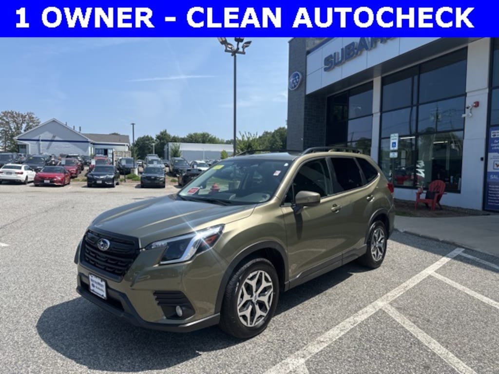 New Price! Autumn Green Metallic 2022 Subaru Forester Premium AWD Lineartronic CVT 2.5L 4-Cylinder DOHC 16V All Wheel Drive AWD, Apple CarPlay-Android Auto, Bluetooth, Moonroof, 6 Speakers, Alloy wheels, AM/FM radio: SiriusXM, CD player, Exterior Parking Camera Rear, Front Bucket Seats, Front fog lights, Heated Front Bucket Seats, Heated front seats, Outside temperature display, Overhead console, Panic alarm, Passenger vanity mirror, Power driver seat, Power steering, Premium Cloth Upholstery, Radio data system, Radio: Subaru Starlink 6.5" Multimedia Plus System, Rear window wiper, Security system, Tachometer, Telescoping steering wheel, Variably intermittent wipers, Wheels: 17" x 7.0J Black Machine Finish Alloy.